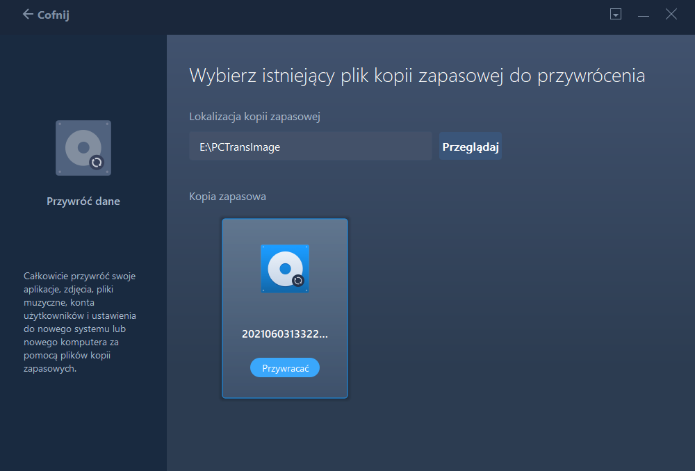 ⚠️ Przywracanie obrazu nadpisuje cały dysk systemowy — wszystkie obecne dane zostaną utracone. Zadbaj o kopie ważnych plików.