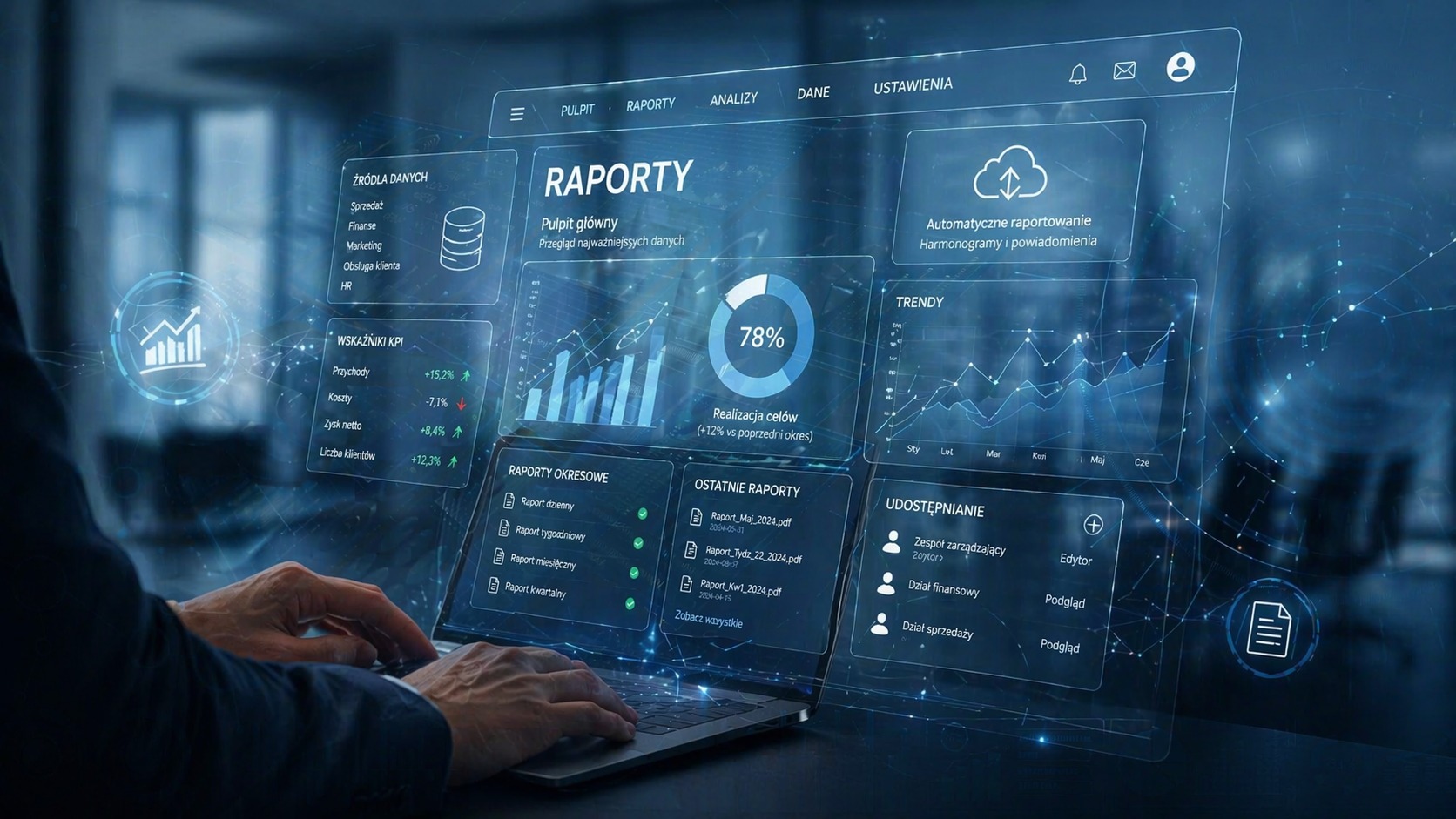 - generować automatyczne raporty, bez ręcznego zestawiania danych;
